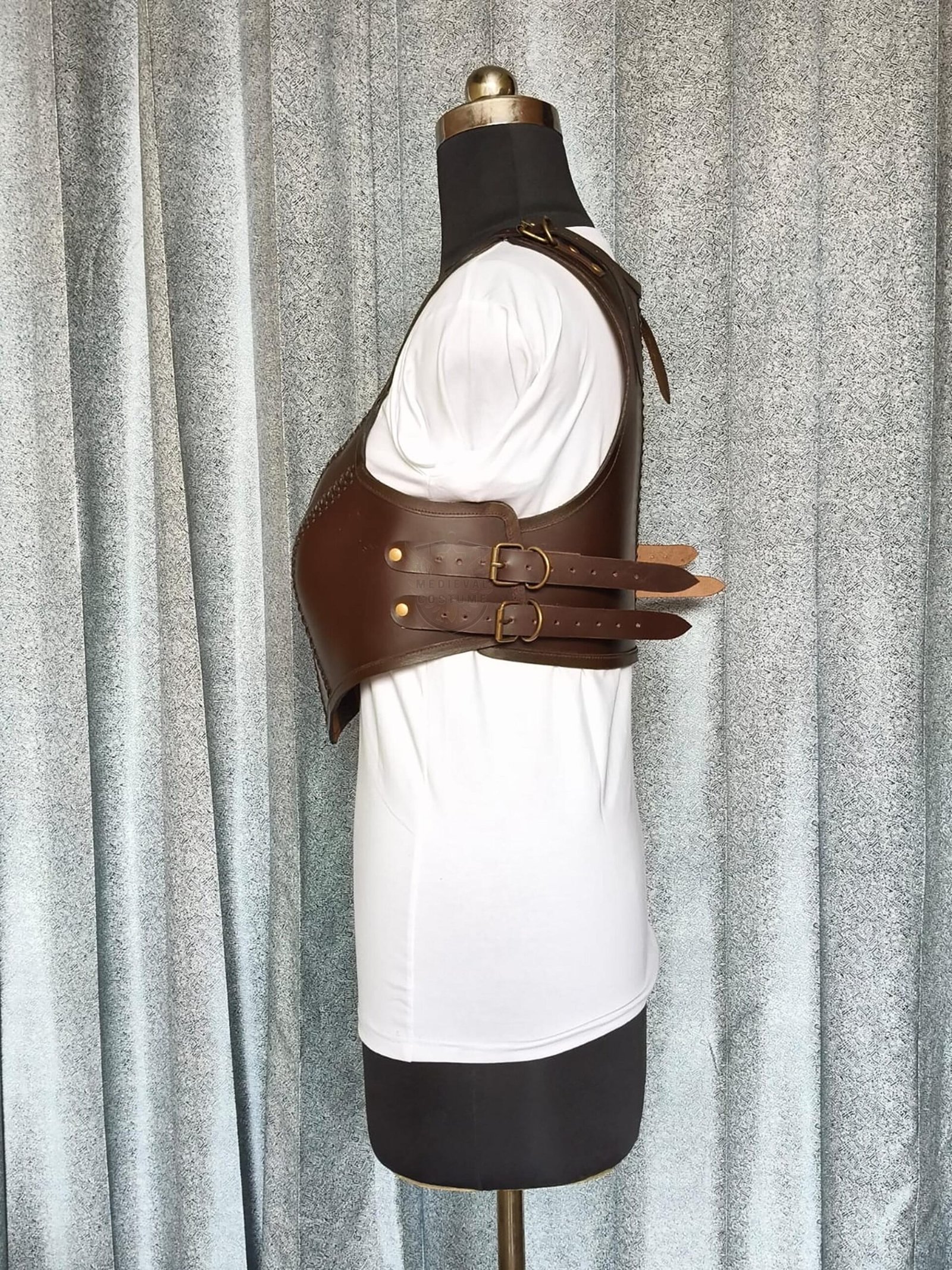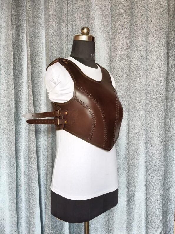 It is handmade leather Renaissance breast plate with hand-sewn leather detailing. It’s fully adjustable Top and side with buckles. We used about 3mm thick handmade veg-tan leather. It is lined with soft leather. Total thickness is 3mm. It is crazy for medieval events and Larp & Cosplay.