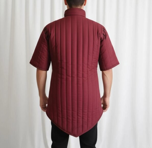 This style of medieval gambeson has tie closures in front with reinforced eyelets. Removable sleeves the gambeson has plenty of (points) to attach various parts of plate armor. Crafted in heavy-duty padded canvas, it has excellent blow-absorbing properties when worn separately and provides superior protection from cuts when worn under chainmail or plate armor. Functional and Battle Ready Arming Wear.