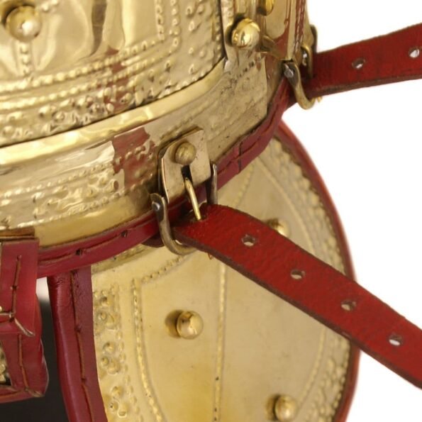 The Deurne helmet’s crown is made of 6 individual parts and the cheek pieces are moveable. The nape protection is attached with two buckled leather straps and is removable and adjustable. The helmet is hand-made from steel and brass and is comfortable due to its leather liner. Nasal, cheeks and nape pieces are covered on the inside with red leather.